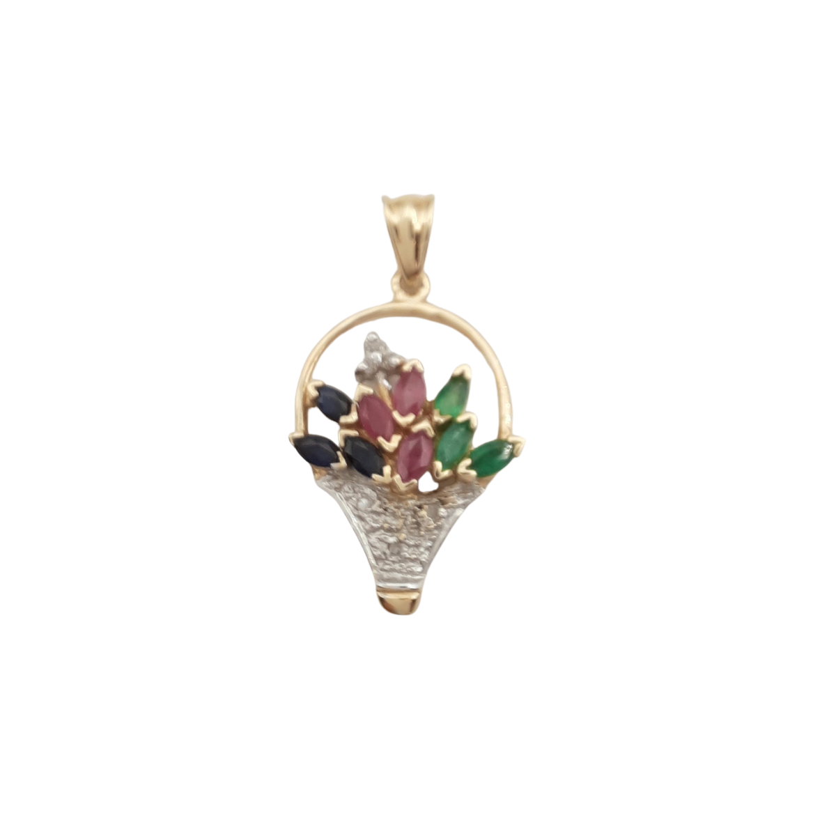 Kukkakorin mallinen upea, kultainen riipus aidoilla safiireilla, rubiineilla,smaragdeilla.
