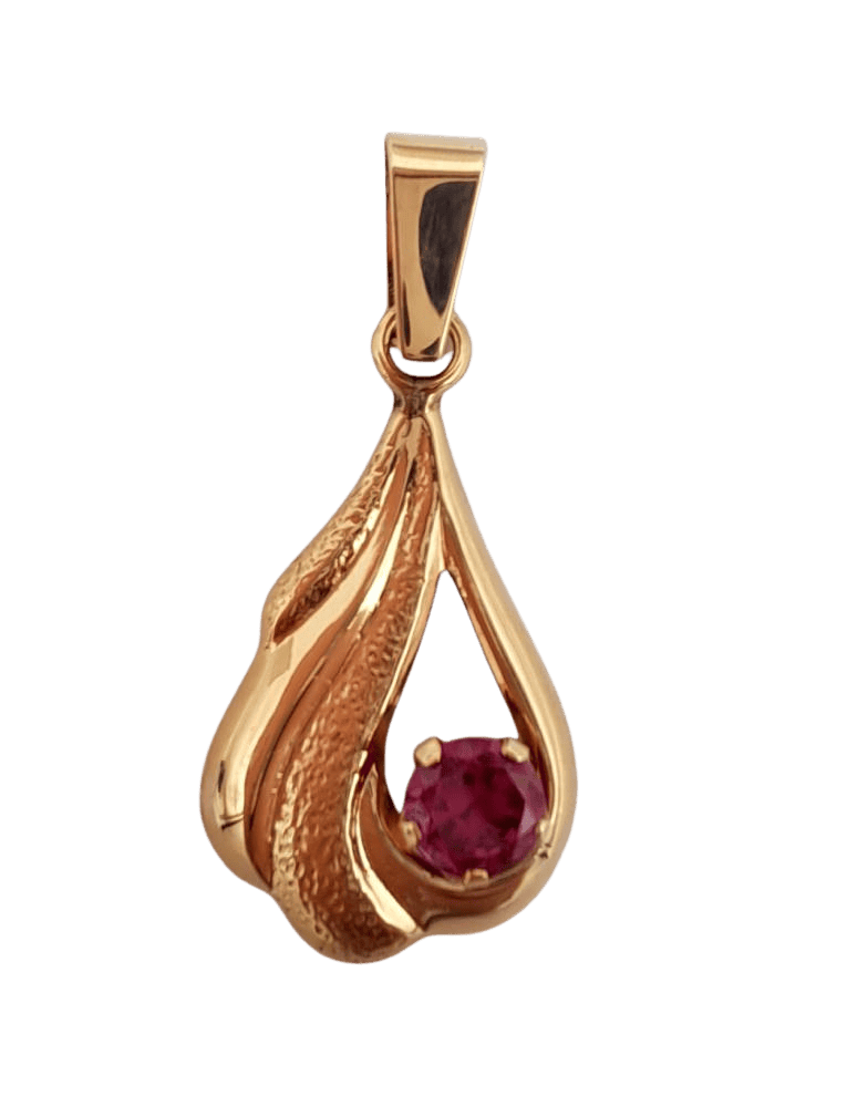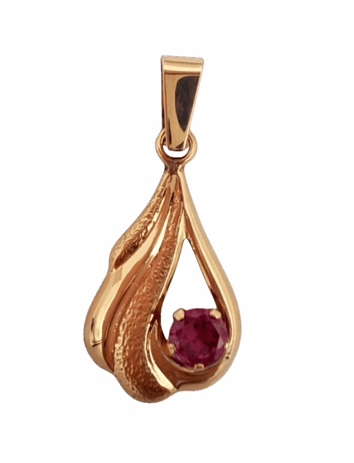 Upea keltakultainen riipus, jossa koristeena kiiltävää ja rouheaa pintaa. Punainen kivi viimeistelee näyttävän riipuksen.
