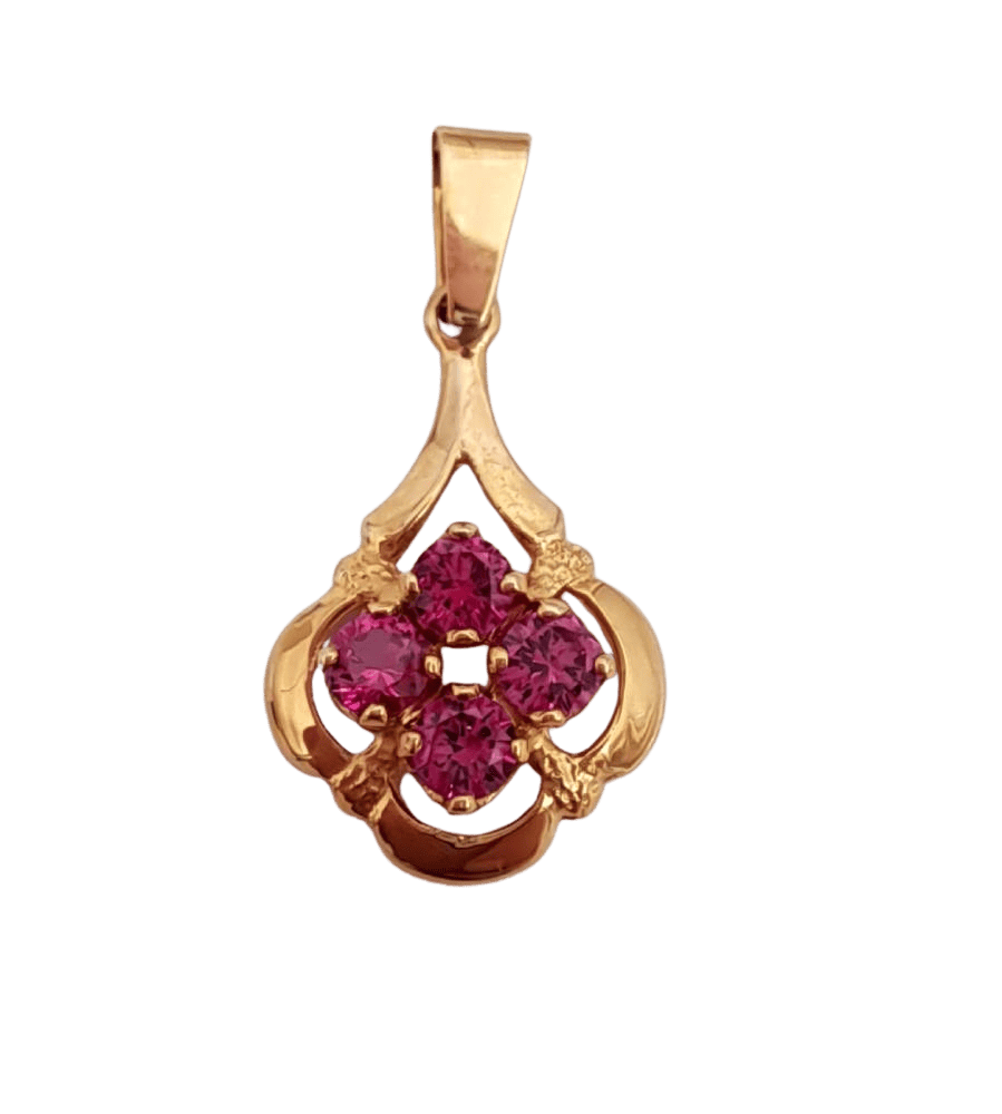 Näyttävä kultainen riipus, jossa kotisteena neljä punaista zirkoniakiveä.