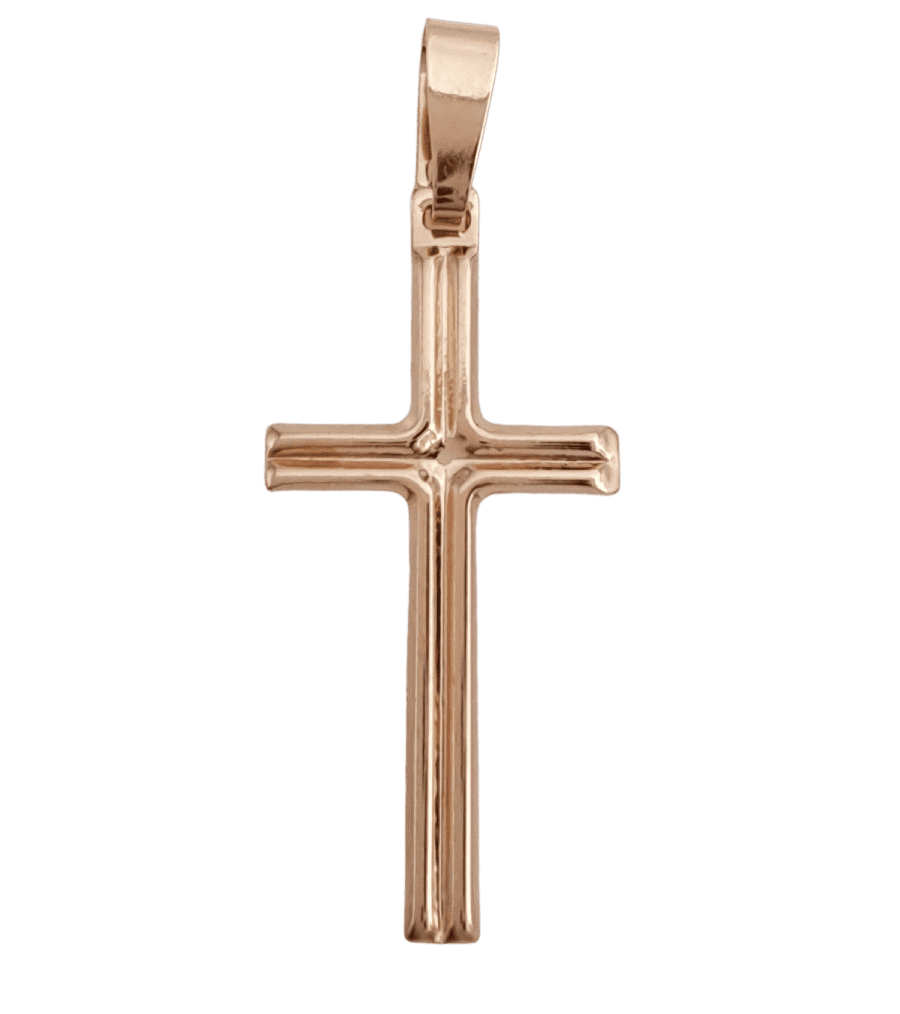 Kultainen, siro rippiristi. Urakuvioitu pohja ja sileät reunat.