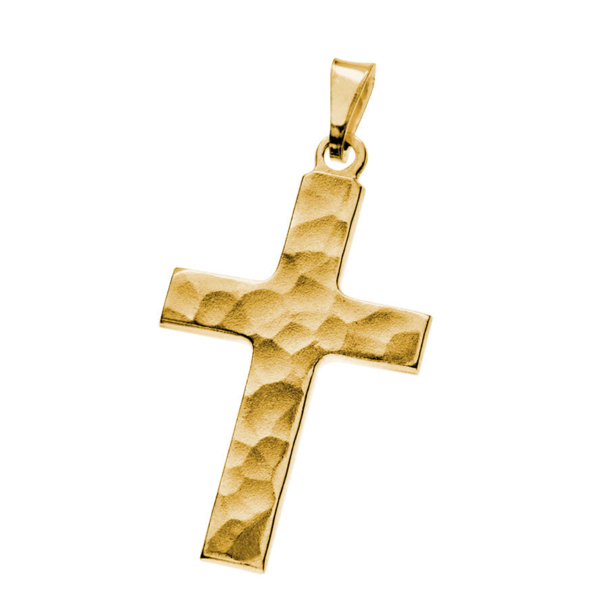 Kaunis kultainen rippiristi. Pinnassa on taottua kuviota.