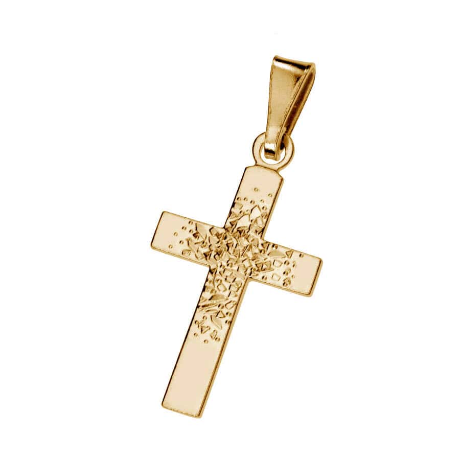 Kaunis kultainen rippiristi. Pinnassa on keskellä rouhittua kuviota.