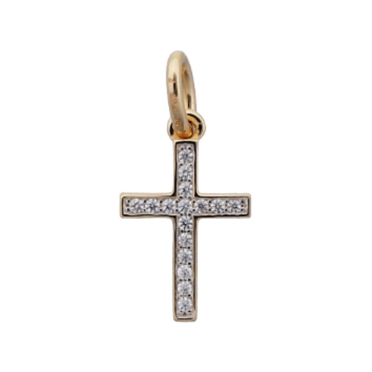 Kaunis kultainen rippiristi. Ristissä on kauniita kirkkaita, kimaltavia zirkoniakiviä.
