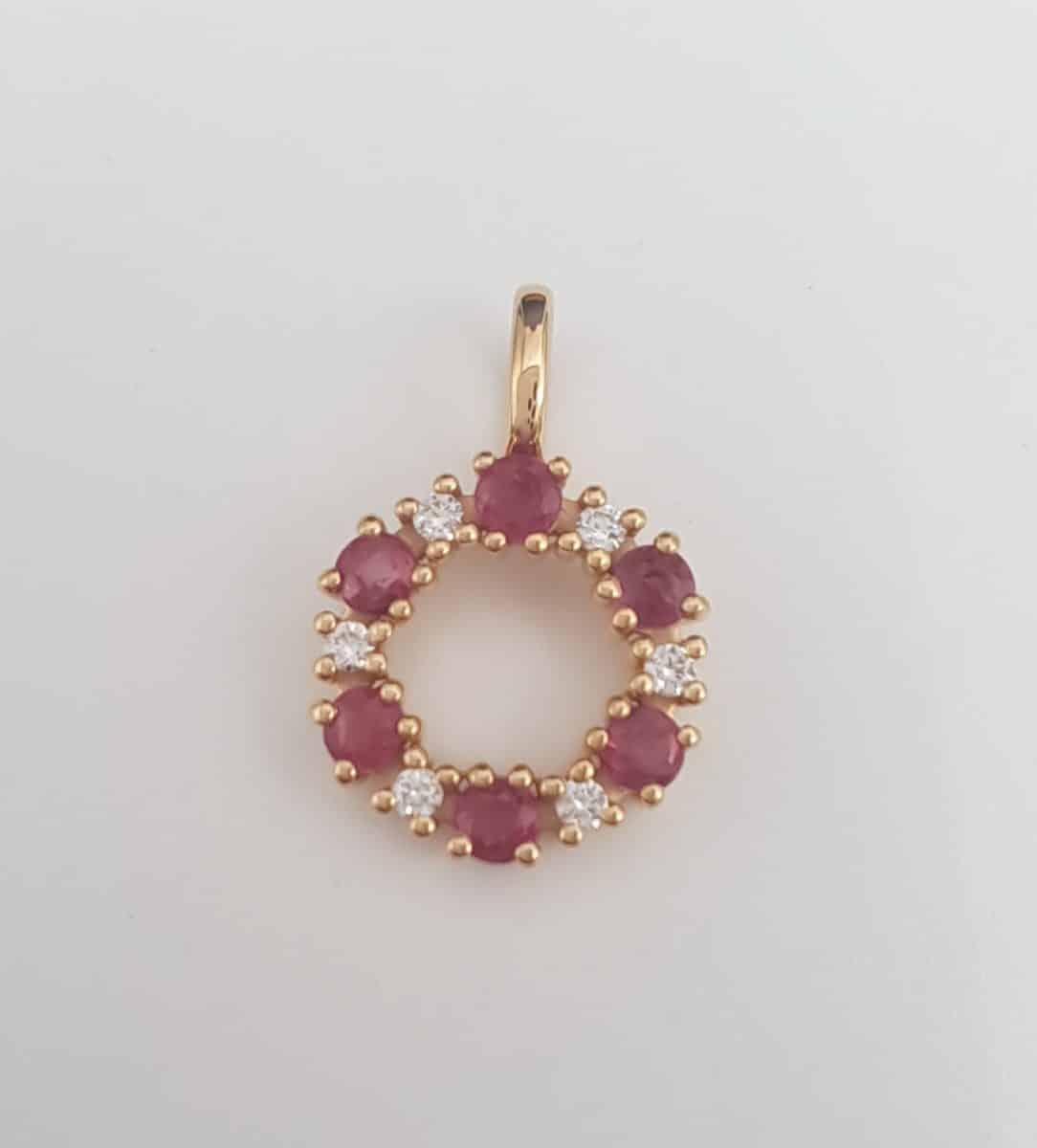Todella upea keltakultainen riipus, jossa punaisia aitoja rubiineja ja kirkkaita aitoja timantteja.