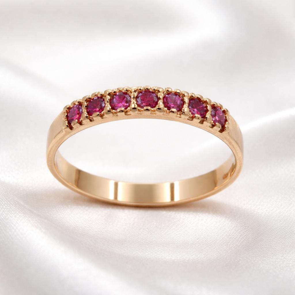 Upea keltakultainen seitsemällä aidolla rubiinilla koristeltu sormus.