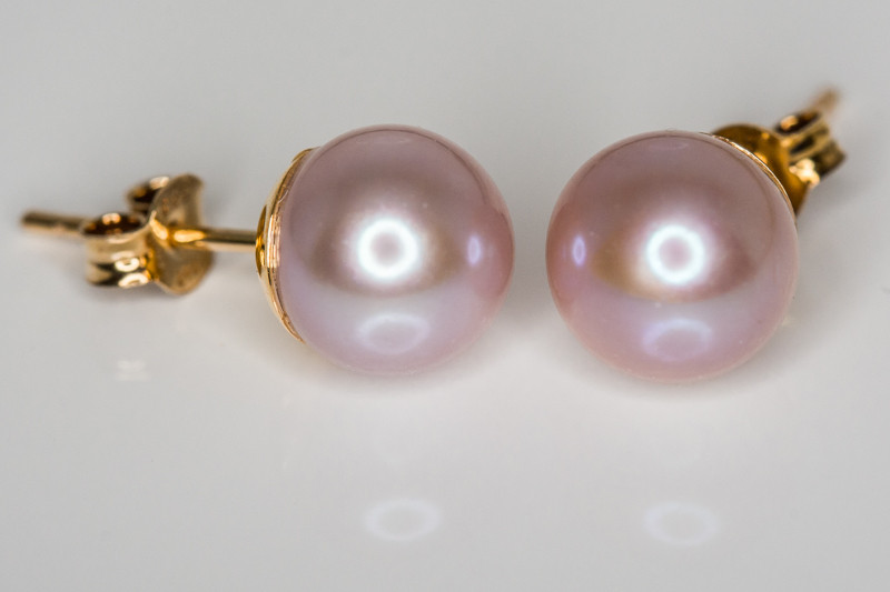 Tyylikkäät kultaiset korvakorut, jossa hempeän ”vanhan roosan” sävyinen helmi.