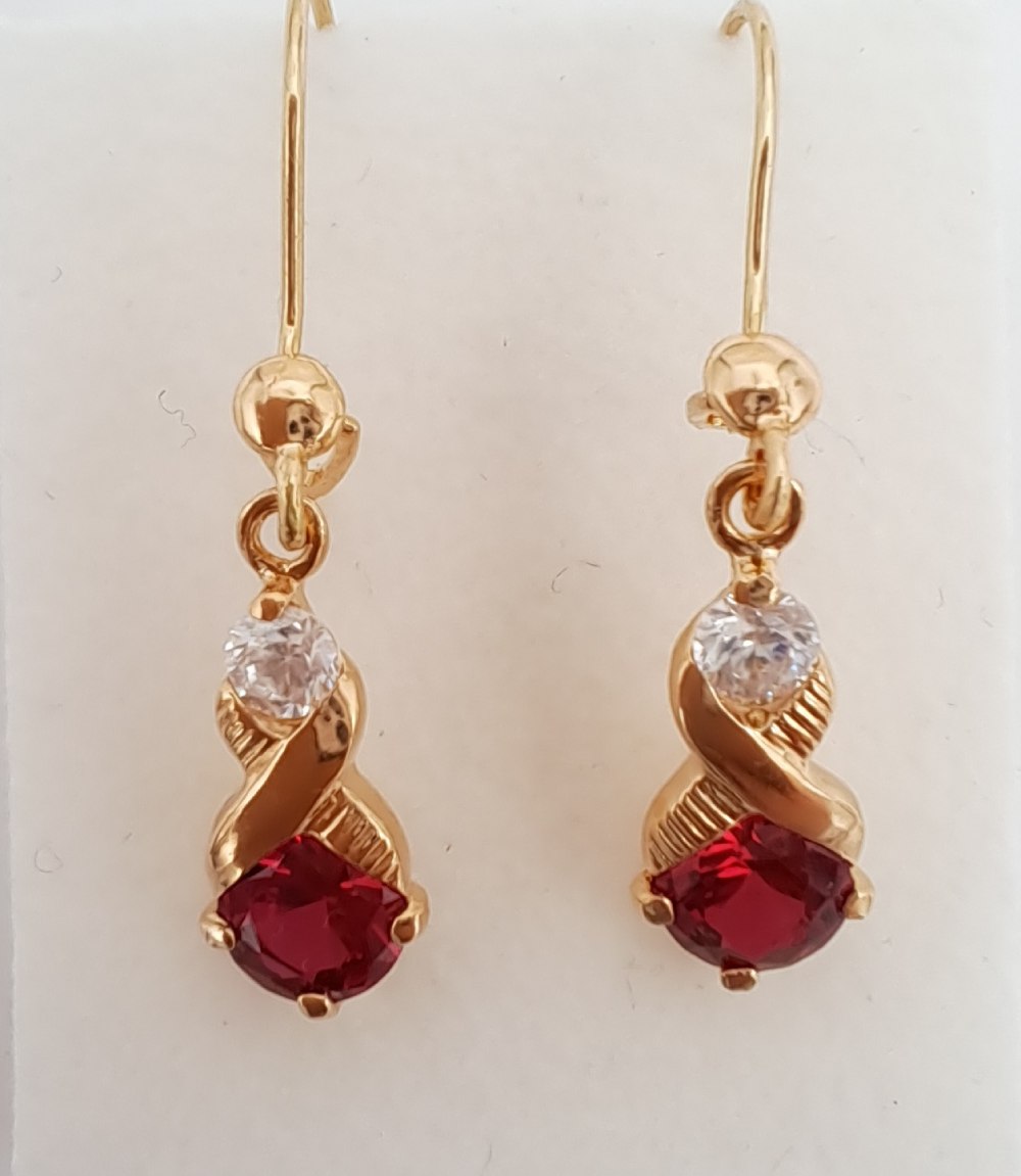 Upeat kultaiset korvakorut punaisilla, kimaltavilla zirkoniakivellä.