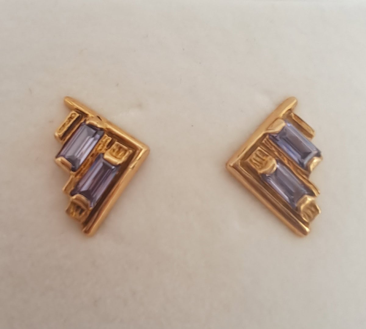 Ihastuttavat kultaiset korvakorut violeteilla kivillä. Nappikiinnityksellä oleva koru on 14 karaatin kultaa.