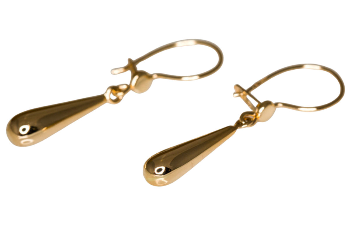 Kultaiset kyynelkorvakorut. Kyyneleen koko on 17 mm. Tukeva koukku, jossa on lukko. Kotimainen tuote.