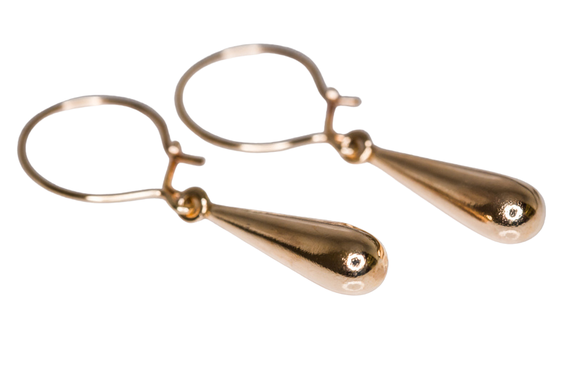 Kultaiset kyynelkorvakorut. Kyyneleen koko on 17 mm. Koukussa on lukko.