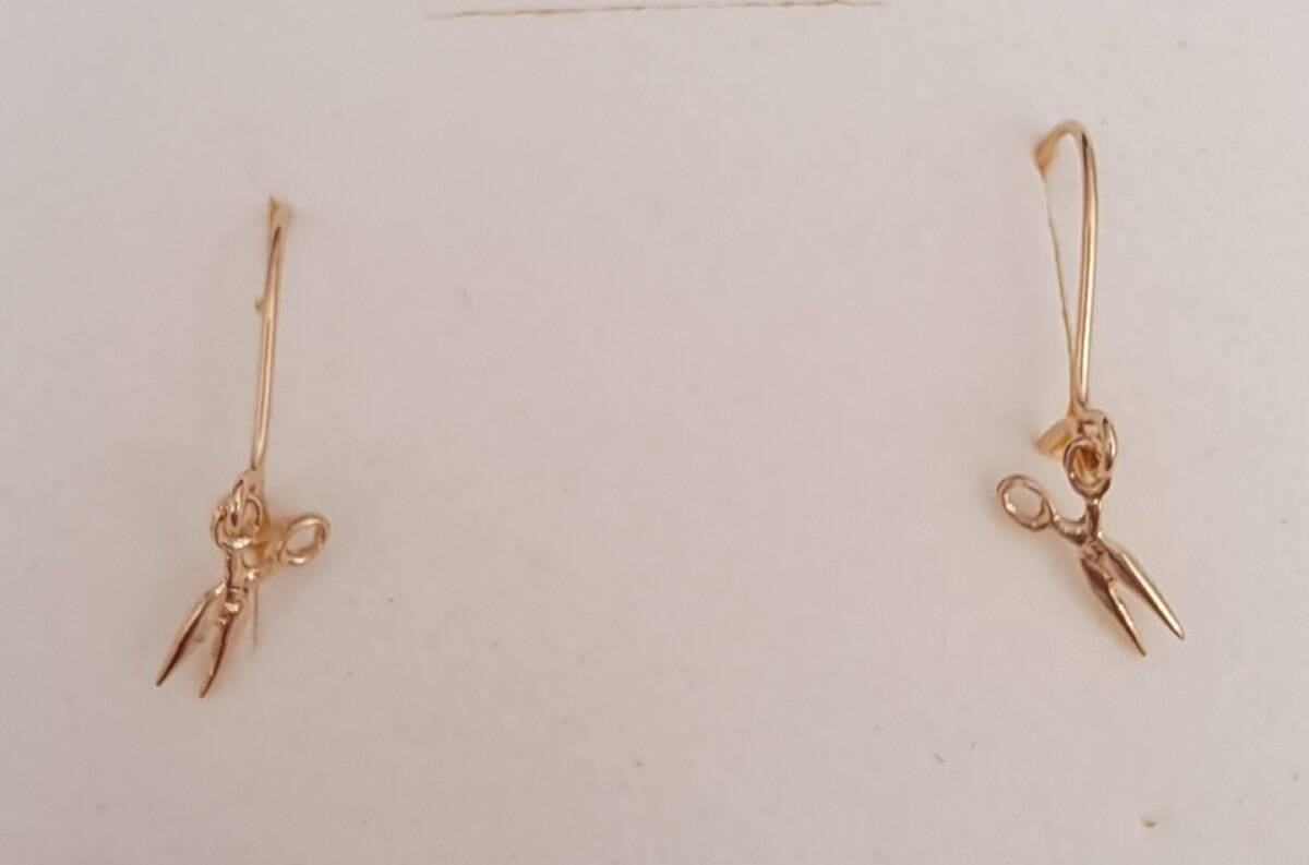 Tyylikkäät kultaiset korvakorut, jossa koristeena pienet sakset