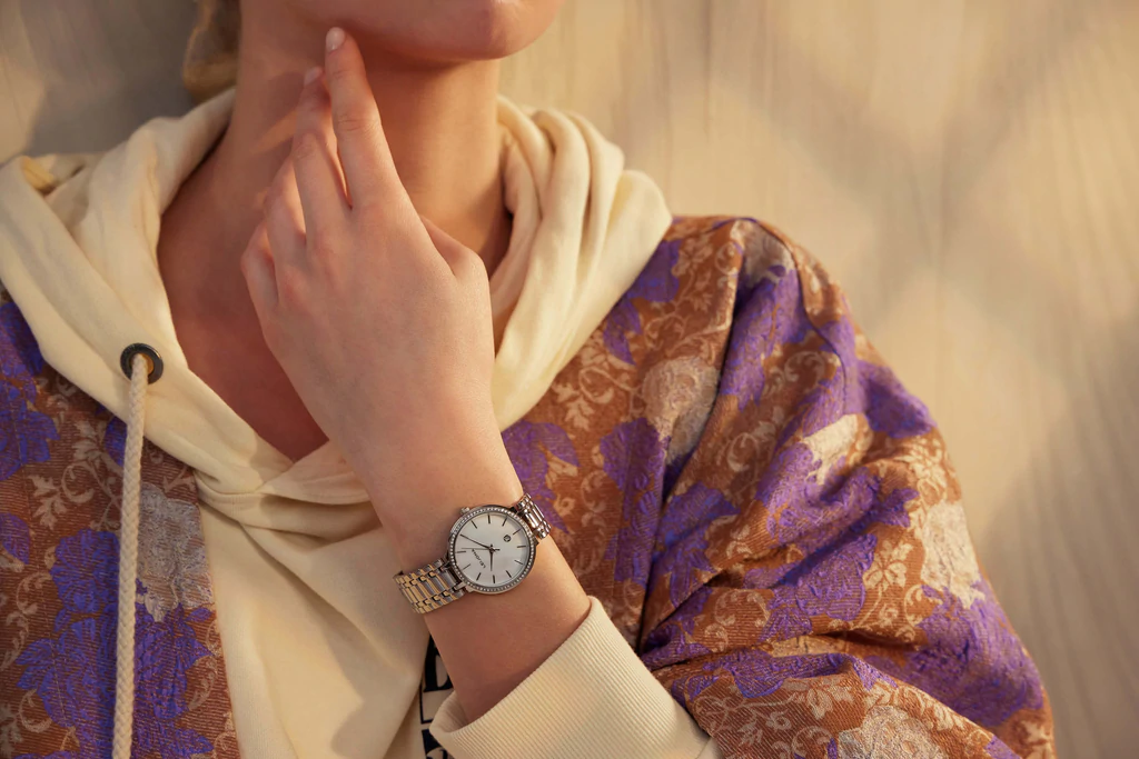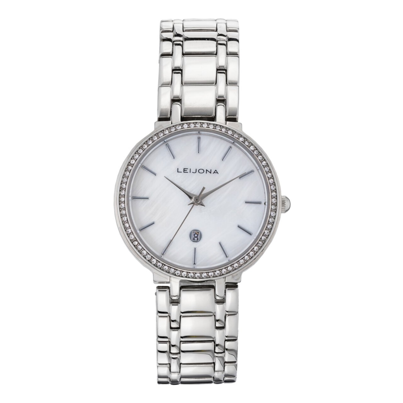 Trendikkäässä kellossa on hopeanvärinen teräsrunko sekä kauniin vaalea helmiäistaulu. Taulussa on hopeanväriset indeksit sekä viisarit, päivyri on sijoitettu kello 6 kohdalle. Kellotaulua ympäröi kaunis kivikehä.