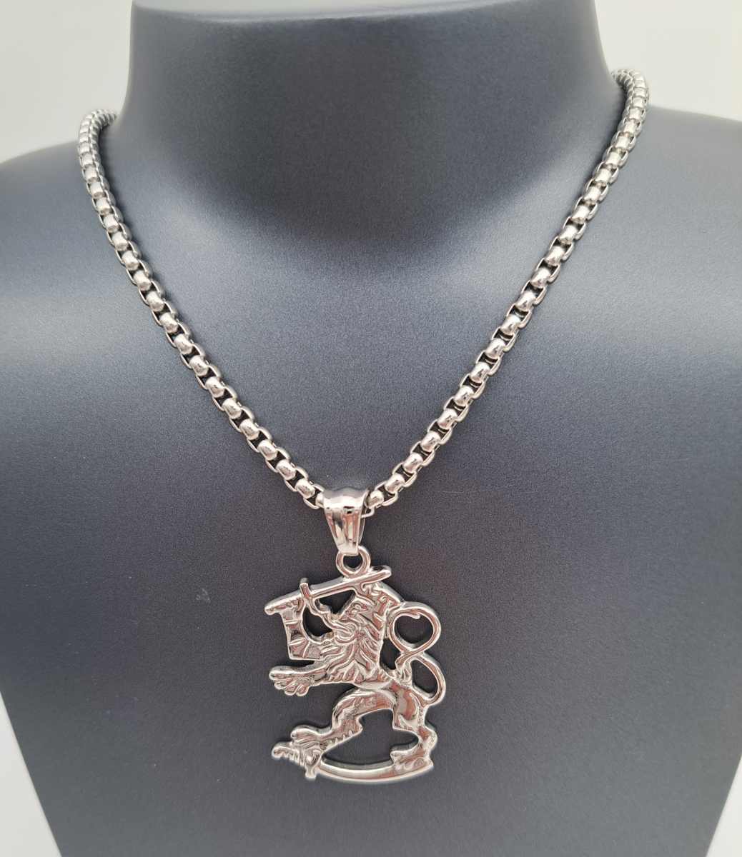 Näyttävä Leijona-riipus kiiltävää terästä.