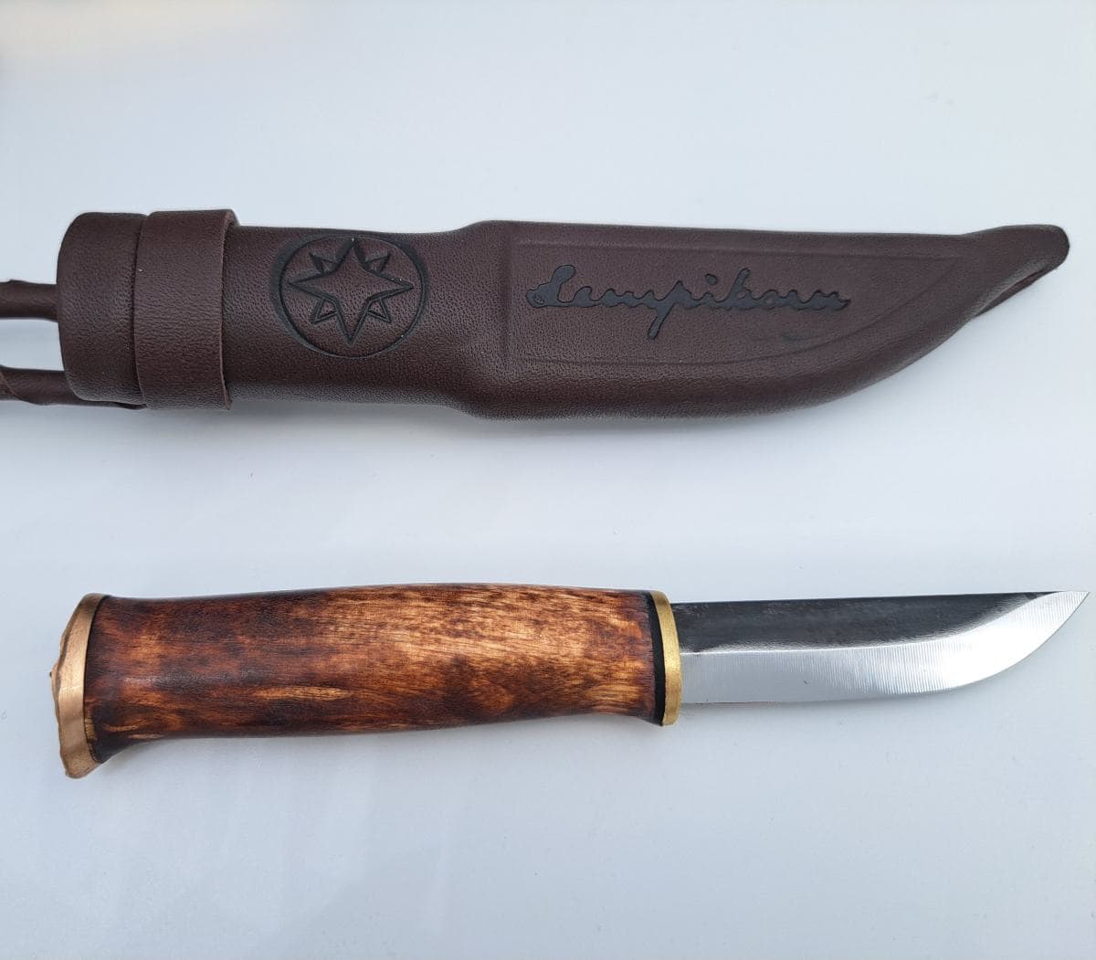 Kotimainen puukko pronsssihelalla, jossa tähden kuva
