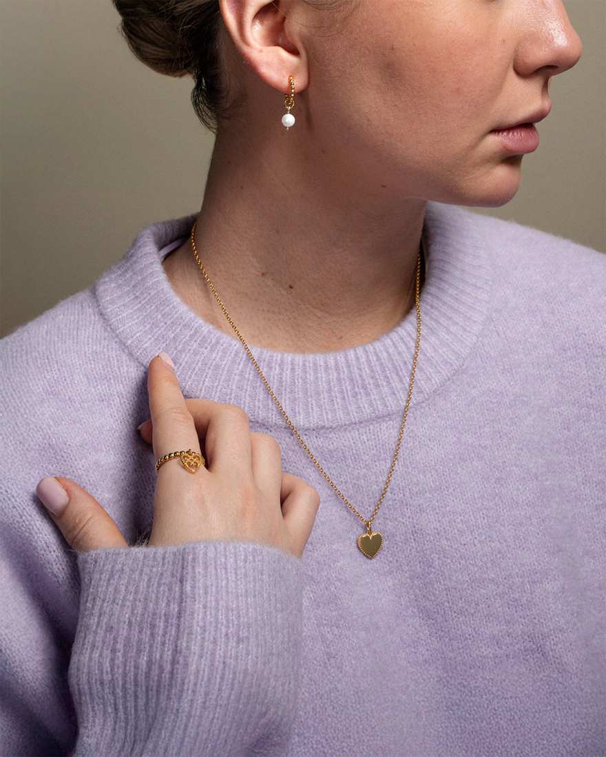 Helmi on pelkistetyn muodon ja hienovaraisen yksityiskohdan kohtaaminen. Siroa muotoa kiertävä helmiäisreuna antaa korulle tunnistettavan ja hienostuneen luonteen. Vuosien kypsyttelyn tuloksena syntynyt muoto kantaa kirkasta viestiä ja kiintymystä, joka tuntuu yhtä aikaa kevyeltä ja merkitykselliseltä.
