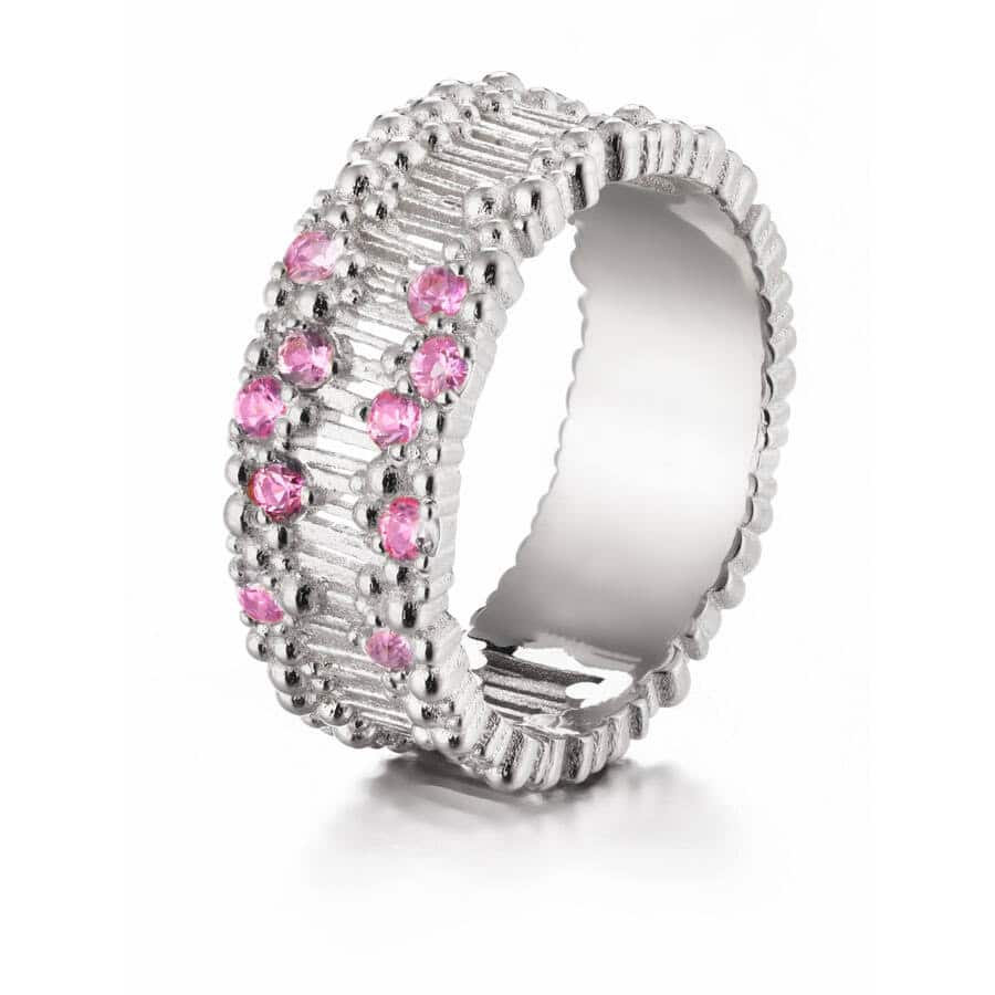 Sormuksen leveys on 7,7mm ja sitƤ on saatavilla koosta 15 kokoon 21 saakka. Sormusta koristaa 10x2mm sƤihkyvƤƤ vaaleanpunaista safiiria