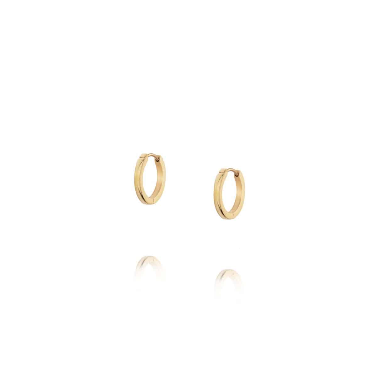 ”Klassiset korvarenkaat napsautuslukolla, valmistettu ruostumattomasta teräksestä ja pinnoitettu 18K kullanvärisellä PVD-pinnoitteella. Kestävät ja vedenkestävät – nämä korvakorut säilyttävät värinsä ja tyylikkyytensä ajan myötä. Täydelliset yhdistettäväksi Shiny Hoops -korvakoruihimme.