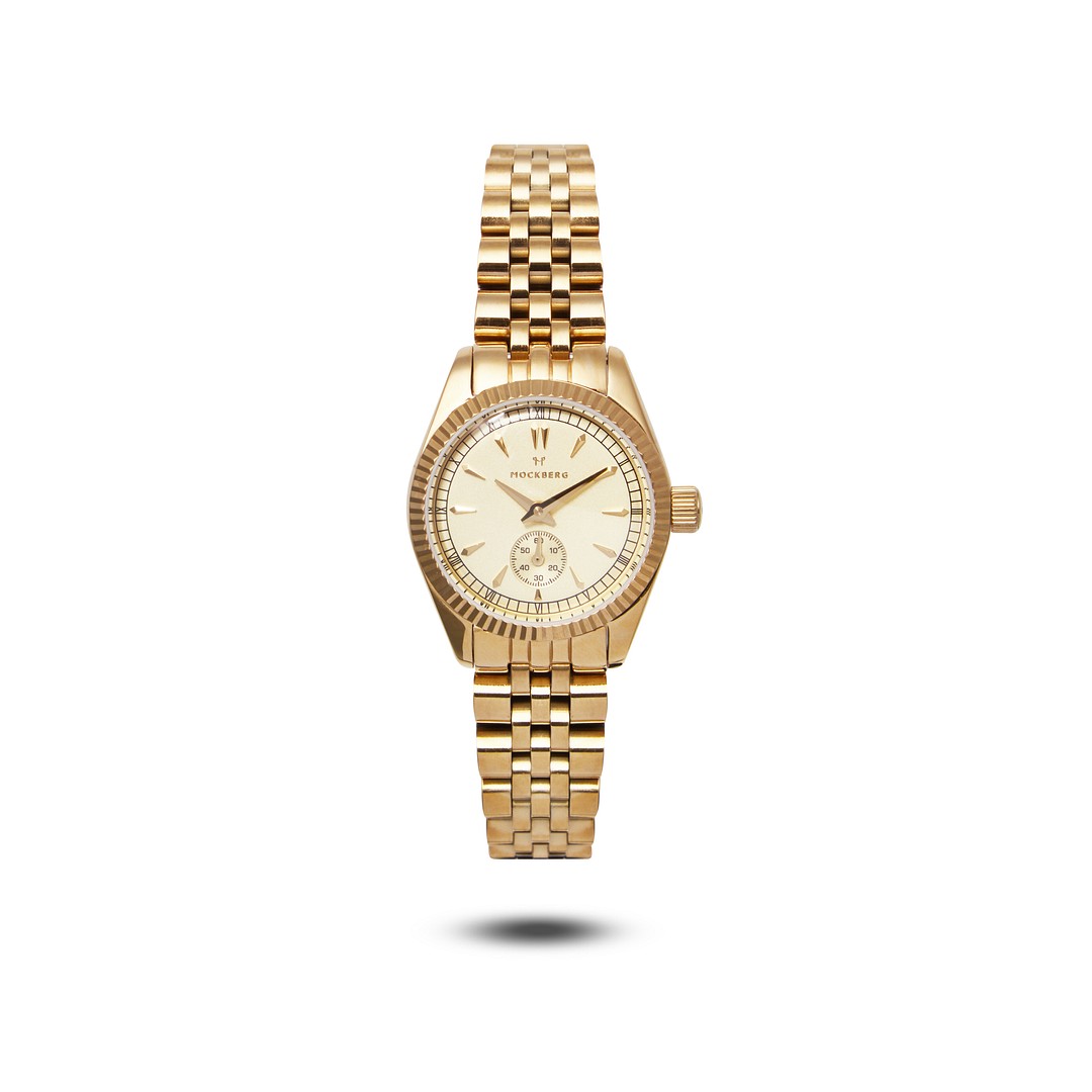 Kellokuori: Kullattu ruostumaton teräs Kellotaulun väri: samppanjan sävy Kuoren halkaisija: 28 mm
