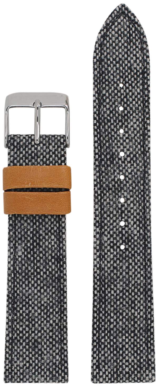 Tweed kankaasta valmistettu kellonranneke nahkavuorella ja lenkeillä. Rannekkeessa kiiltavä terässolki.