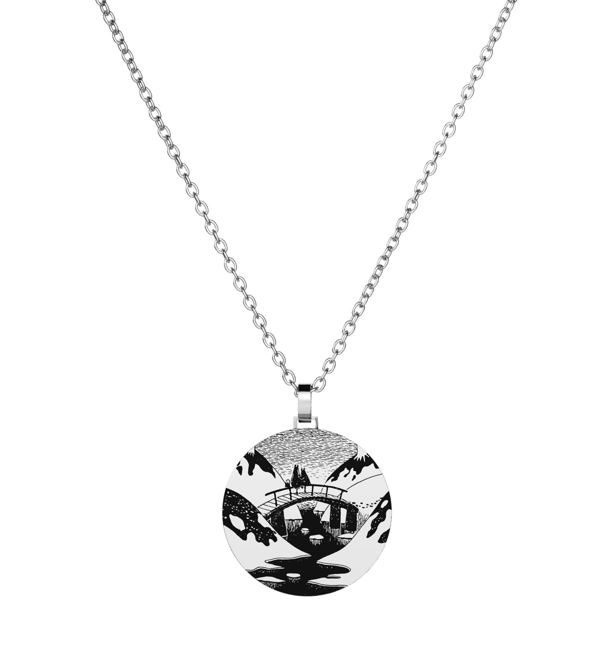 Kaulakorun riipuksessa on yksityiskohtainen kuvitus Muumilaakson sillasta, jolla istuskelee Muumimamma sekä Muumipeikko. Riipuksen halkaisija 32mm. Ketju on säädettävissä kahteen eri pituuteen; 70cm ja 85cm. Materiaaliltaan kaulakoru on ruostumatonta terästä. Tuotteet on pakattu Muumi-aiheisiin rasioihin.