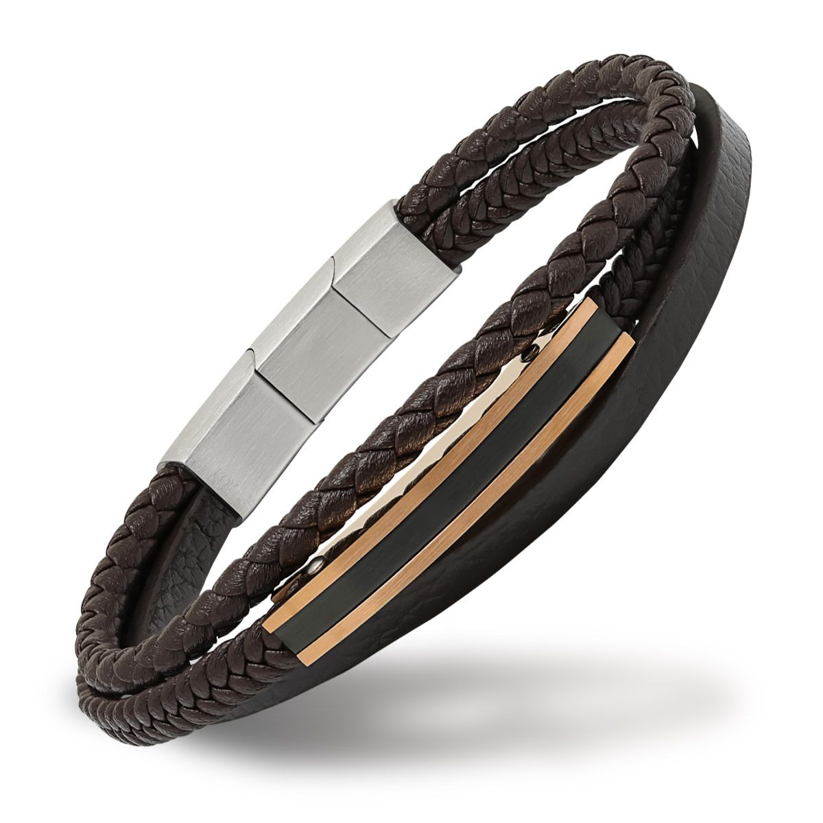 Miesten tyylikäs nahkarannekoru punakullatulla teräslaatalla
