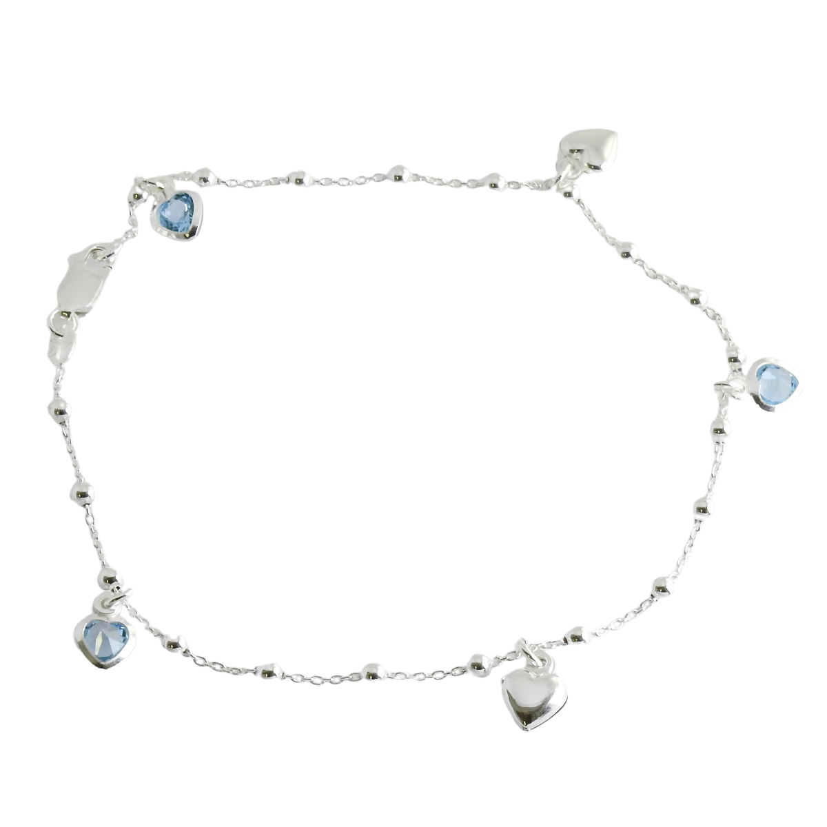 Ankkuriketju, jossa koristeena palloja, sydämiä ja sydämiä sinisellä kivellä.