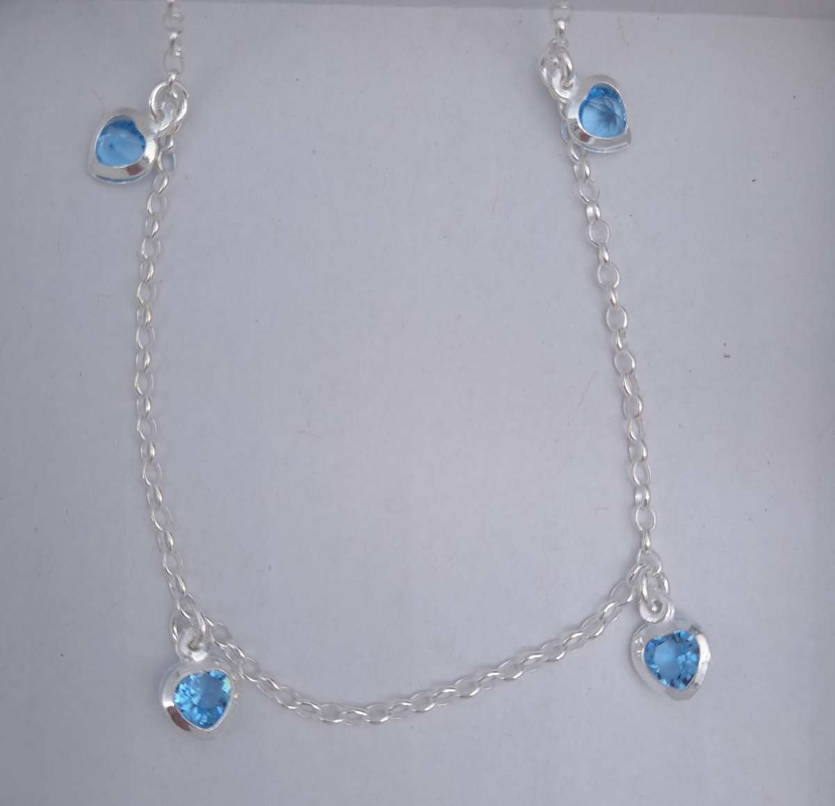 Ihastuttava hopeinen nilkkakoru, jossa koristeena viisi vaaleansinistä zirkoniasydäntä