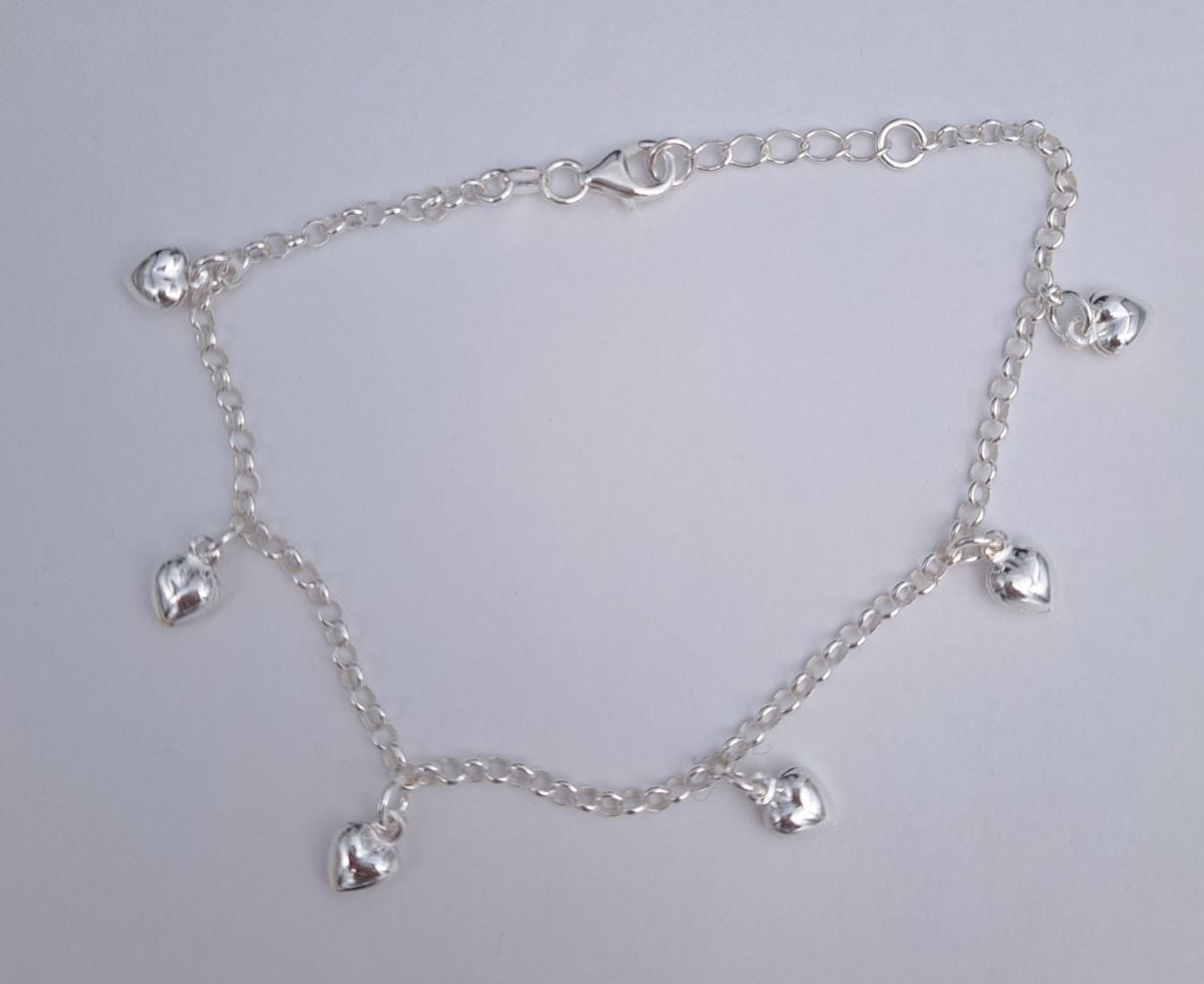 Ihastuttava hopeinen nilkkakoru, jossa koristeena kuusi sileää sydäntä