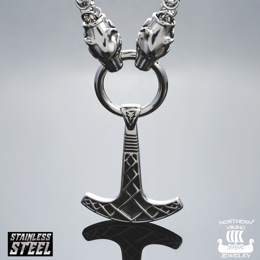 Northern Viking Jewelry®-Kuningasketju Sudenpäillä sekä Ukonvasara riipus. Ketjun päässä Odinin sudet Geri ja Freki. Kuningasketju oli viikingeillä merkkinä vauraudesta ja voimasta.