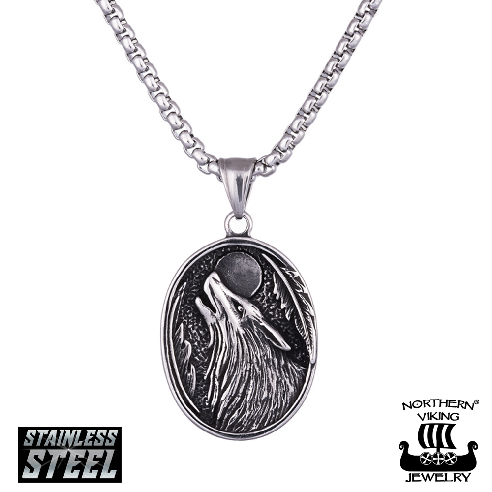 316L-teräksestä valmistettu Kaulakoru Northern Viking Jewelry Wolf & Moon. Riipuksen toisella puolella Vegvisir-kuvio.