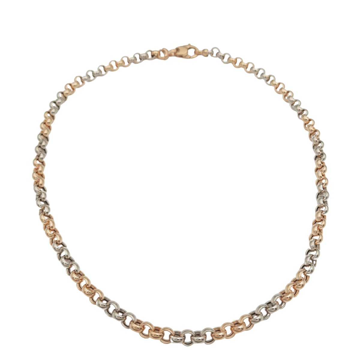 Upea ja näyttävä papukaulaketju kelta- ja valkokultaa.