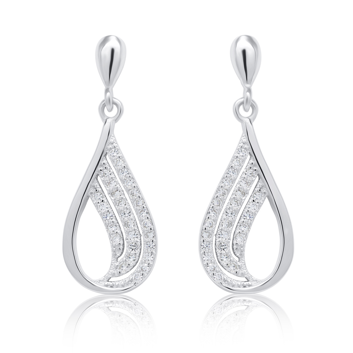 Kauniit zirkonein koristellut roikkuvat hopeakorvakorut nappikiinnityksellä.