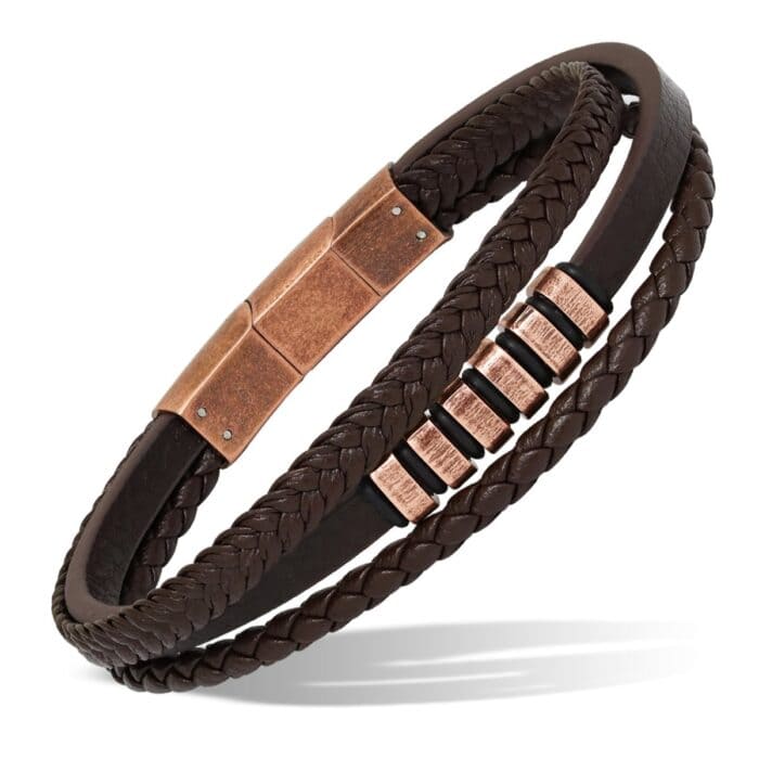 Miesten tyylikäs kolmiosainen, ruskea nahkarannekoru antiikki punakullatuilla teräskoristeilla ja lukolla.