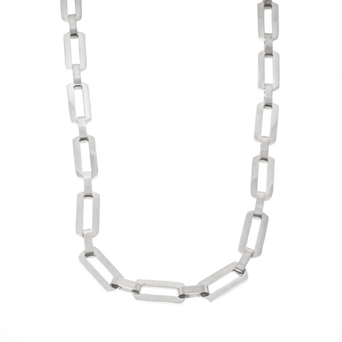 Pelkistetty, kiiltävä teräskaulaketju, palaketjua. Ketjussa on säädettävä pituus 42-47 cm.