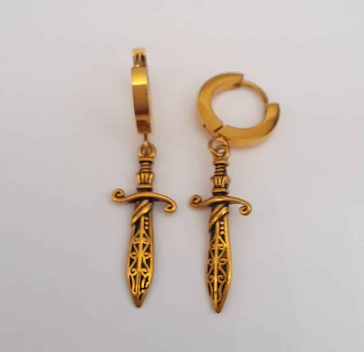 Näyttävät teräksiset renkaat, jossa koristeena tikari. Korvakoruissa kultaus päällä