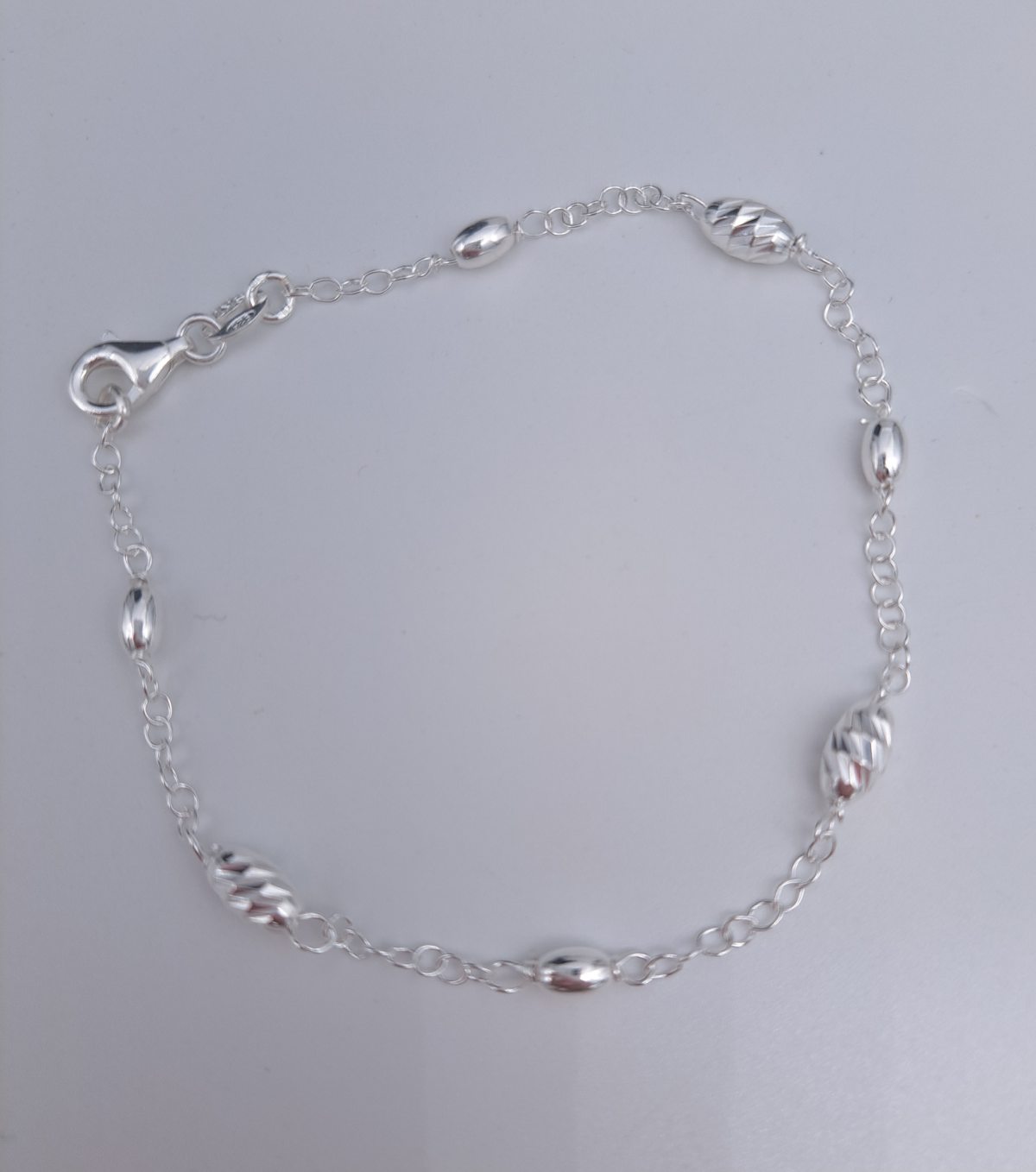 Hopeinen ranneketju timanttileikatuilla ovaalipalloilla ja sileillä ovaalinmallisilla palloilla Pallon koko 4×7 mm ja 3×4 mm