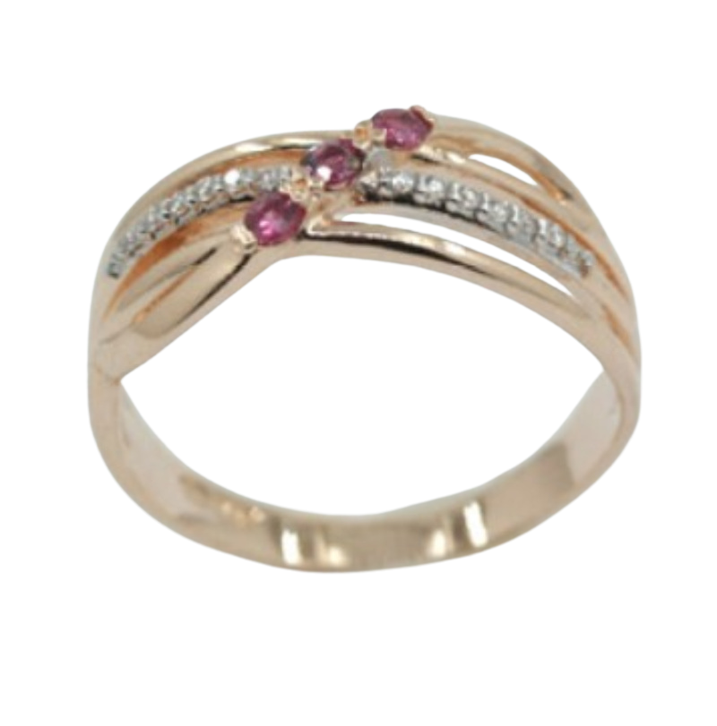 Upea sormus, jossa timantteja ja kolme rubiinia.