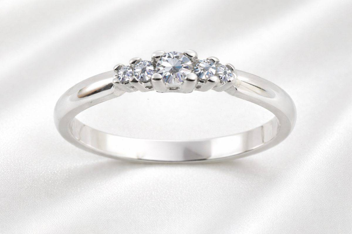 Upea sormus, jossa edessä yksi isompi timantti ja reunoilla 4 timanttia.