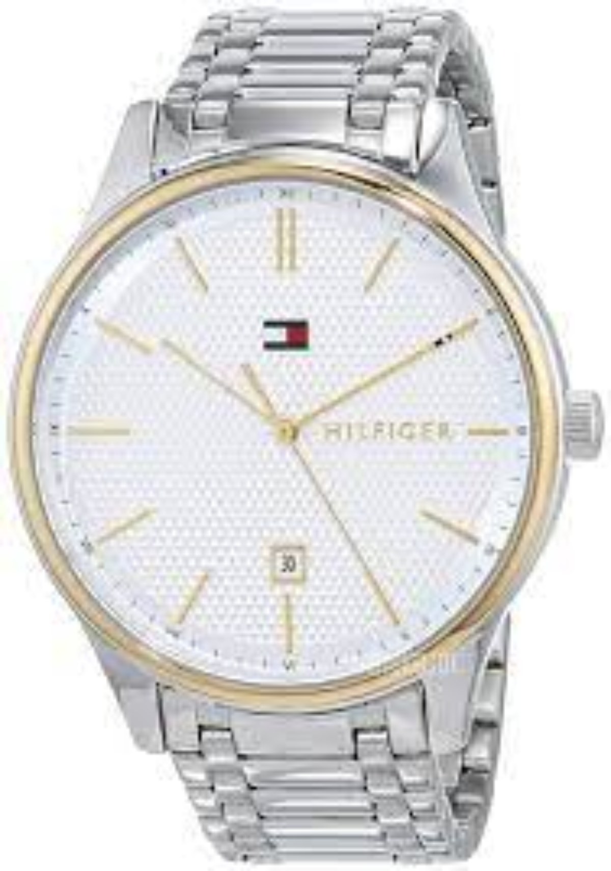 Tommy Hilfiger Damon miesten rannekello on valmistettu ruostumattomasta teräksestä. Teräksisen rannekkeen kanssa hopeanvärinen kuvioitu kellotaulu kullatulla kehällä on todella tyylikäs. Kello on roiskevesitiivis.