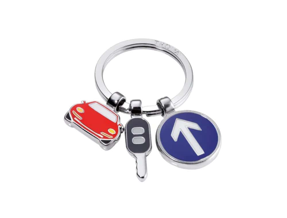 Kolme ainutlaatuista riipusta: auto, autonavain ja liikennemerkki – suunnittelu: Anne Rieck.