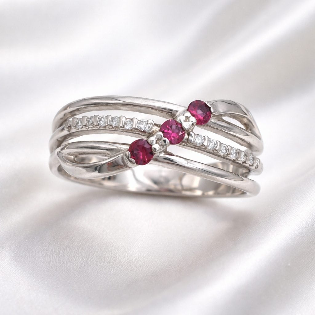 Upea sormus, jossa timantteja ja kolme rubiinia.