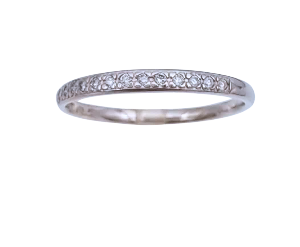 Ihastuttava valkokultainen timanttisormus, jossa rivissä kauniisti istutettuja timantteja.
