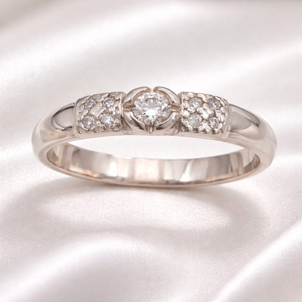 Upea valkokultainen timanttisormus, jossa keskellä isompi timantti ja reunoilla pienempiä.