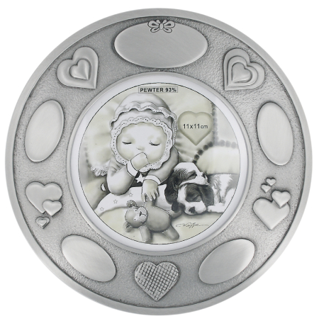 Suloinen valokuvakehys kastelahjaksi pienokaiselle. Muoto on pyöreä.