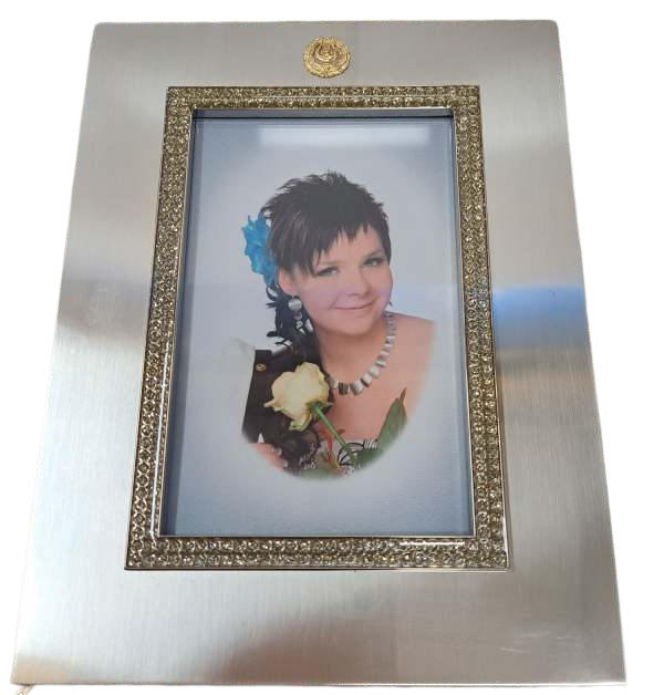 Ihastuttava kehys lahjaksi ylioppilaalle. Kullanväriset kivet kiertävät kuvaosaa.